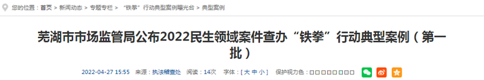 安徽省芜湖市市场监管局公布2022民生领域案件查办“铁拳”行动典型案例(第一批)