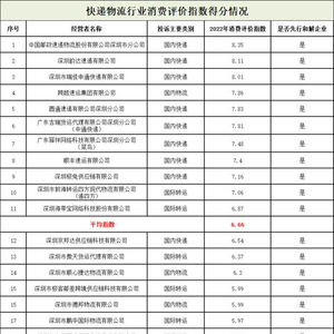为加强对深圳市快递物流行业的社会监督,客观公正地反映经营者应对消费纠纷的处理机制,深圳市消费者委员会近日发布2022年快递物流行业消费评价指数排行榜,指引消费者选择重信誉守信用的经营者进行消费,督促快递物流经营者提升自身服务质量,营造安全放心的消费环境。