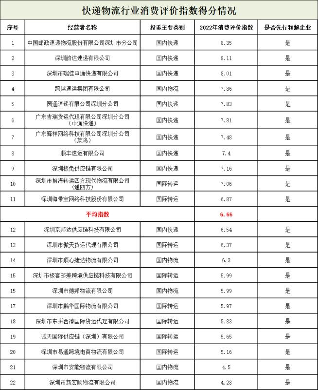 市消委会依据2021年4月1日至2022年3月31日期间的“315消费通”消费投诉数据,对年有效投诉量5宗及以上的22家快递物流经营者进行消费评价指数排名。22家经营者均与消委会建立先行和解通道,平均消费评价指数为6.66分,行业消费评价指数处于较高水平。消费者可以通过“深圳市消费者委员会”官网及微信公众号、“315消费通”小程序、深圳信用网、“i深圳”APP、百度“爱企查”等平台查询更多经营者实时动态消费评价指数,优先选择消费评价指数高的经营者进行消费。