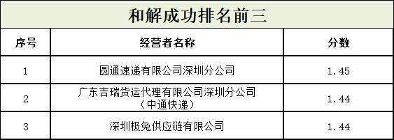 和解成功排名前三分别为:圆通速递有限公司深圳分公司、广东吉瑞货运代理有限公司深圳分公司(中通快递)及深圳极兔供应链有限公司。和解成功是指投诉在和解阶段,经营者和消费者就消费纠纷处理意见达成一致意见的成功率。