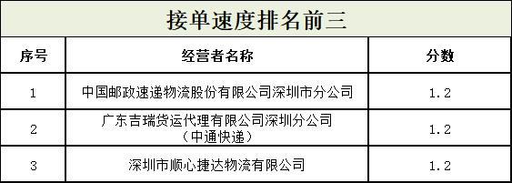 其中接单速度排名前三分别为:中国邮政速递物流股份有限公司深圳市分公司、广东吉瑞货运代理有限公司深圳分公司(中通快递)及深圳市顺心捷达物流有限公司。接单速度得分反映的是经营者在接到消费者投诉时,消费者投诉等待处理的时间,经营者得分高说明其积极响应投诉处理机制,短时间内能作出有效回应。