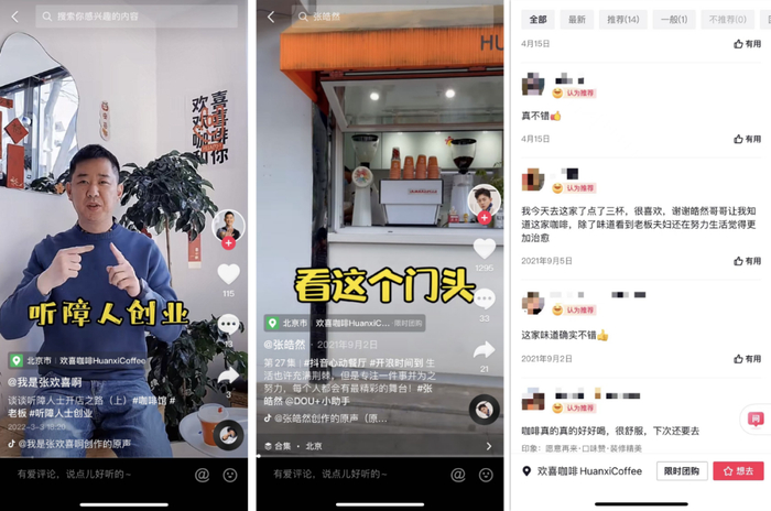 听障人士,咖啡师张龙也在抖音上开设账号,发布咖啡作品短视频并带上门店地址POI,吸引了不少粉丝到门店来打卡。每周稳定更新的短视频,给这家位置略显偏僻的的咖啡馆带来了令人欢喜的人气。