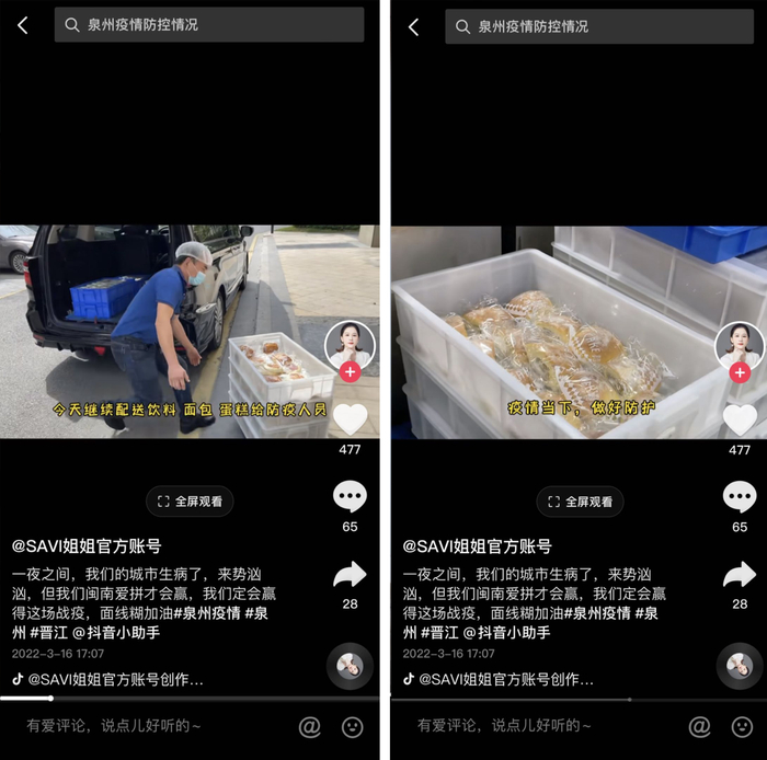 Savi也希望在抖音上做点什么。疫情期间,她和工作室的伙伴积极为医护人员赠送面包和甜点,拍视频给他们加油。她希望在抖音上,可以连接更多的人。