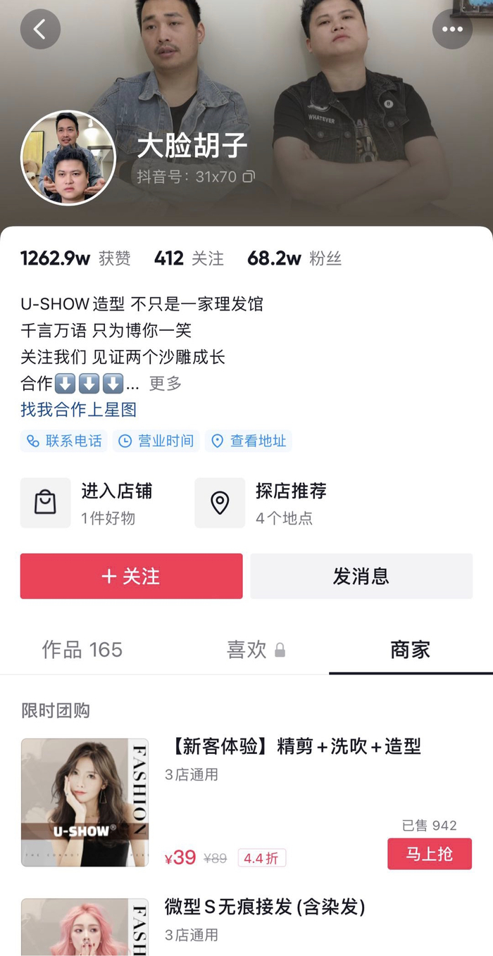 接触抖音四年后,杨科的造型店从濒临解散,到扩张出六家门店。在抖音上也积累起70万的粉丝,产出多条点赞过万的视频,在抖音上的团购券销售额也达到了近200万。可以说:是短视频,盘活了他们的生意。