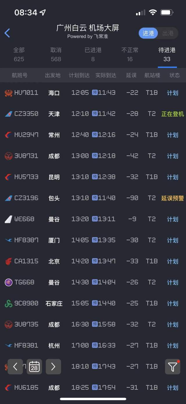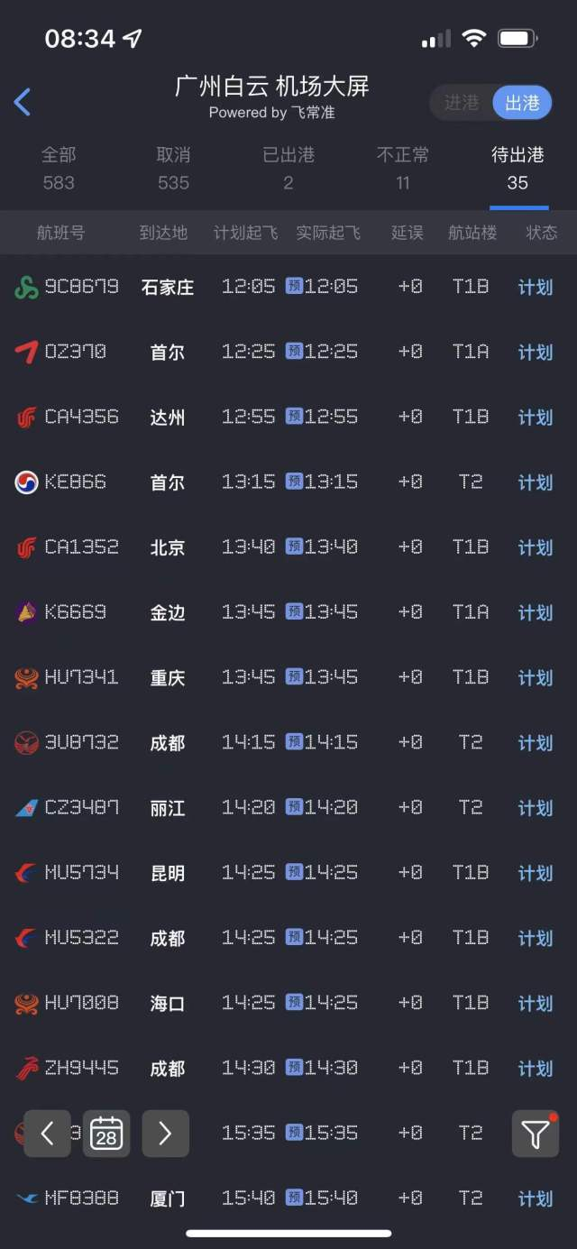 截至4月28日14:50,据飞常准APP显示,广州白云机场今日已执行进出港航班20架次,待执行进出港航班34架次。其中12:00以后已执行进港航班9架次,暂无出港航班,待出港航班12架次,包含国内和国际航班。