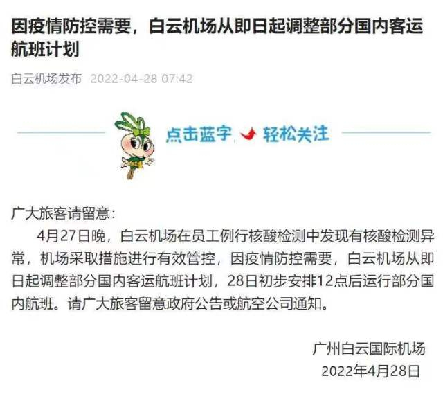 广州白云国际机场今晨发布公告,4月27日晚,白云机场在员工例行核酸检测中发现有核酸检测异常,机场采取措施进行有效管控,因疫情防控需要,白云机场从即日起调整部分国内客运航班计划,28日初步安排12点后运行部分国内航班。请广大旅客留意政府公告或航空公司通知。