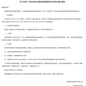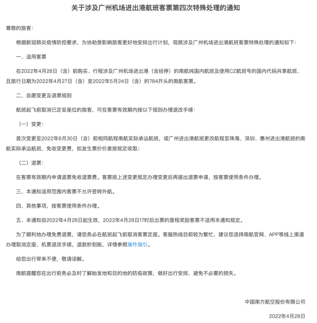 4月28日,南方航空发布通知,对涉及广州机场进出港航班客票第四次特殊处理发出提醒,符合条件的南航客票可进行免费退改签。
