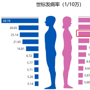 甲状腺癌在女性群体中直线上升,与2012年全国癌症流行病学统计数据相比,女性甲状腺癌发病率由第七位上升至第三位。