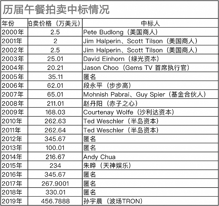 从2000年至今已有四位华人与巴菲特共进午餐,分别是2006年的段永平、2008年的赵丹阳、2015年的朱晔以及2019年的孙宇晨。身为为数不多的中标的中国人,他们的个人经历和谈话内容无疑引发了人们格外的关注。