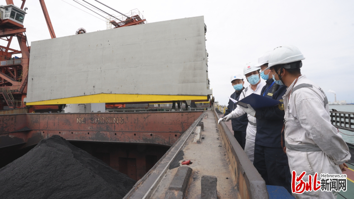 4月27日,在唐山港曹妃甸港区,曹妃甸海事工作人员检查电煤运输船舶货物装载情况。 河北日报通讯员 吕瑞欣摄