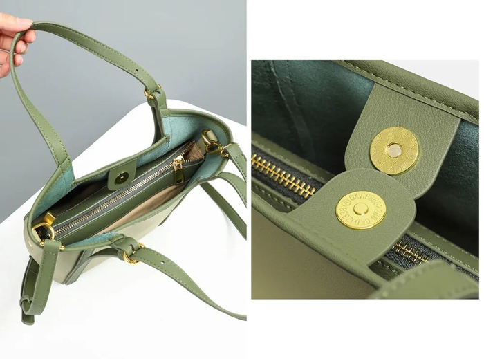 包包开合处为拉链+磁吸扣的双重设计,让包内物品不易往外掉,更安全。
