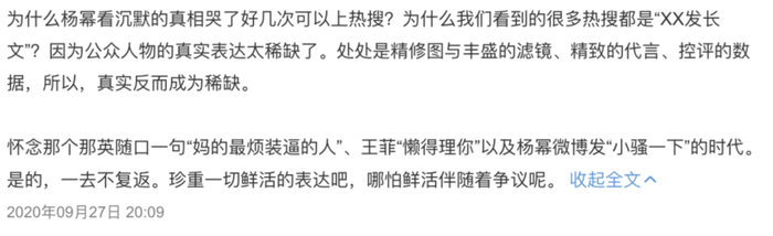 明星之间在微博上的社交沟通可能是由其工作室代发似乎尚且还在接受的范围里面。毕竟网友们引用那英老师“X的最烦装X的人”,怀念明星们都还真情实感发微博的时代的时候,达成的共识就是现在微博上已经没有“真人”明星,也知道很多明星的微博账号尤其是公开账号基本上也等同于其所在工作室的“营业博”,日常只是用来发布作品通告和广告。
