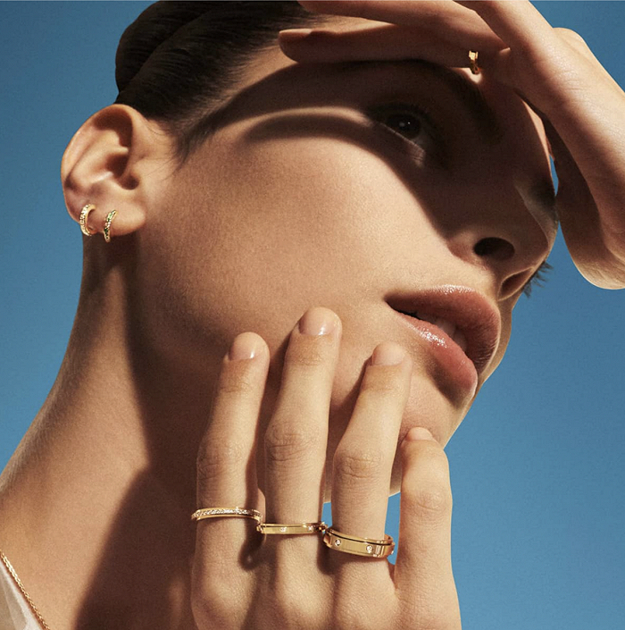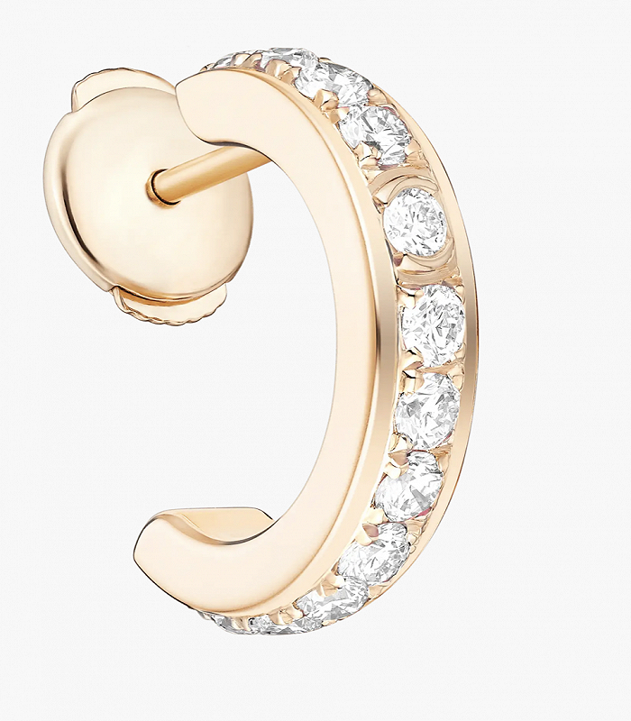 伯爵Possession时来运转珠宝系列,以充满乐趣的旋转装置为特色,主打单品囊括耳饰、戒指、项链等。女士耳环提供玫瑰金/白金两款,简单的拱形设计周围镶嵌着一排闪耀的钻石,尽显精致优雅风尚,温暖的玫瑰金色调,中间点缀单颗镶嵌钻石,华美而迷人。