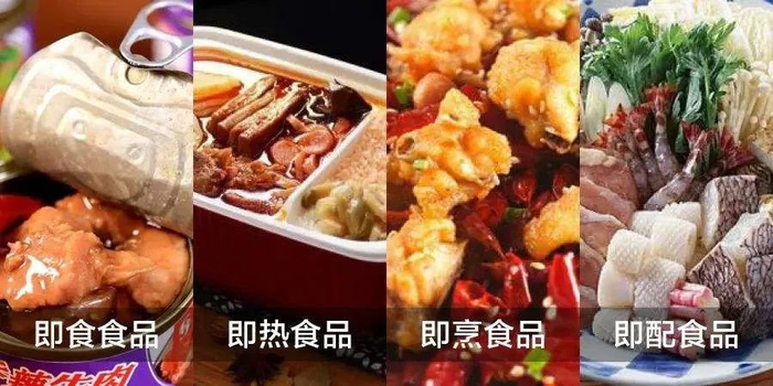 即食菜肴(八宝粥、牛肉干)、即热菜肴(速冻水饺、方便面)、即烹菜肴(鱼香肉丝、宫保鸡丁)、即配菜肴(切好洗净的各种配菜)。