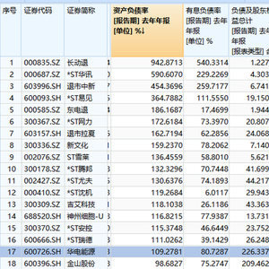 负债情况方面,已发布财报的这些上市公司的资产负债率的算数平均值为41.92%,中位数为39.85%。截至目前已有17家上市公司资不抵债,包括长动退(000820.SZ)、退市中新(603996.SH)等退市在即的上市公司。尚未资不抵债,但资产负债率超过80%的上市公司已有197家。