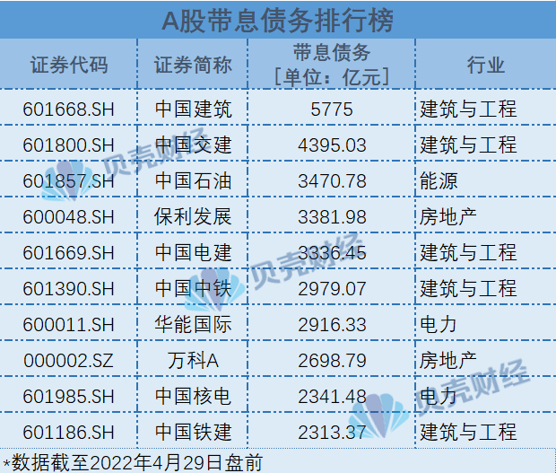 带息债务规模较大的上市公司多来自地产、建筑行业,且以央企、国企居多,前十位中的唯一一家民企为万科A(000002.SZ)。