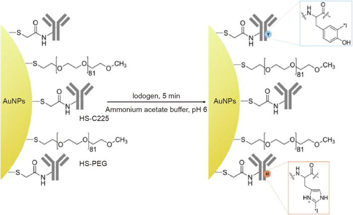 已确认的与非小细胞肺癌相关的驱动基因是首要的潜在治疗目标。近几十年来,无机纳米颗粒已被广泛研究用作靶向癌症治疗的药物或药物递送系统,金纳米颗粒由于其独特的光学性质、低毒性以及易于制备和功能化而受到关注。为了实现纳米颗粒在肿瘤组织中的最大聚集并提高效率,已使用各种配体对金纳米颗粒进行了修饰。与等剂量的游离甲氨蝶呤(MTX)相比,与MTX结合的金纳米颗粒在Lewis肺癌小鼠模型中表现出高水平的肿瘤滞留和增强的治疗效果,这可能归因于MTX-金纳米颗粒的“浓缩效应”。EGFR是一种细胞表面受体,在多种肿瘤类型中过度表达,包括非小细胞肺癌。近年来,EGFR靶向抗体已成为非小细胞肺癌治疗的流行靶向策略。Yokoyama等报道Clone 225抗体偶联的混合等离子体磁性纳米颗粒(C225-AuFe纳米颗粒)通过诱导细胞凋亡和自噬表现出增强的抗肿瘤活性。此外,一种新型放射免疫治疗剂131I-C225-金纳米颗粒-PEG已成功合成(图3),并且对高表达EGFR的人A549肺癌细胞表现出增强的内吞作用和细胞毒性;它还主动靶向接种A549肿瘤细胞的小鼠。金纳米颗粒通过抗体介导的内吞作用可更好地被细胞摄取。由于金和硫基团之间发生强烈的选择性相互作用,通过硫键化学吸附到金纳米颗粒表面的含硫靶向配体可以提高效率。金纳米颗粒也是小RNA(miRNA)的理想载体,它可以进一步作为特异性抑制剂。
