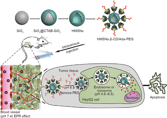 图4. 肿瘤微环境级联pH响应药物递送系统(介孔二氧化硅纳米粒子-β-环糊精/腺苷脱氨酶-聚乙二醇)的示意图。CTAB:N-十六烷基三甲基溴化铵;HepG2:人肝癌细胞。