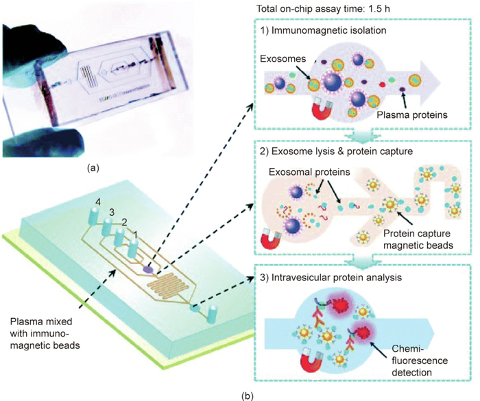图2. 一个用于非小细胞肺癌患者外泌体分析的微流体外泌体分析平台。(a)包含一个用于外泌体分析的微通道网络的聚二甲基硅氧烷芯片;(b)一个集成了外泌体免疫磁珠分离、外泌体裂解、蛋白质捕获和蛋白质分析的微流体外泌体分析平台。