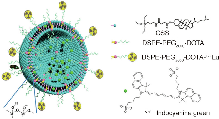 Jing等成功制造了一种名为ICG@DPDC-177Lu的强大的治疗诊断陶瓷体,用于近红外荧光成像和癌细胞的光热消融。他们将吲哚菁绿(ICG)封装在1,2-二硬脂酰-sn-甘油-3-磷酸乙醇胺-N-[羧基(聚乙二醇)2000]-1,4,7,10-四氮杂环十二烷-1,4,7,10-四乙酸单酰胺(DSPE-PEG2000-DOTA)中,然后螯合放射性同位素177Lu。ICG@DPDC-177Lu可作为一种放射性核素癌症疗法;在体内,ICG@DPDC通过光热效应有效消融癌细胞(图5)。