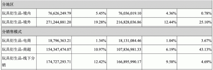 分地区来看,去年,公司玩具产品以出口为主。玩具衍生品“境外”收入占总体营收比重19.28%,上年同期为12.44%、“境内”占比5.45%,上年同期4.36%;分销售模式来看,2021年,玩具衍生品在“线下分销”的营收占总体营收比重最高,为12.42%,2020年同期为9.58%、其次是“商超”,占比10.97%,上年同期为6.19%、排列最末是“电商”,占比1.34%,上年同期为1.04%。
