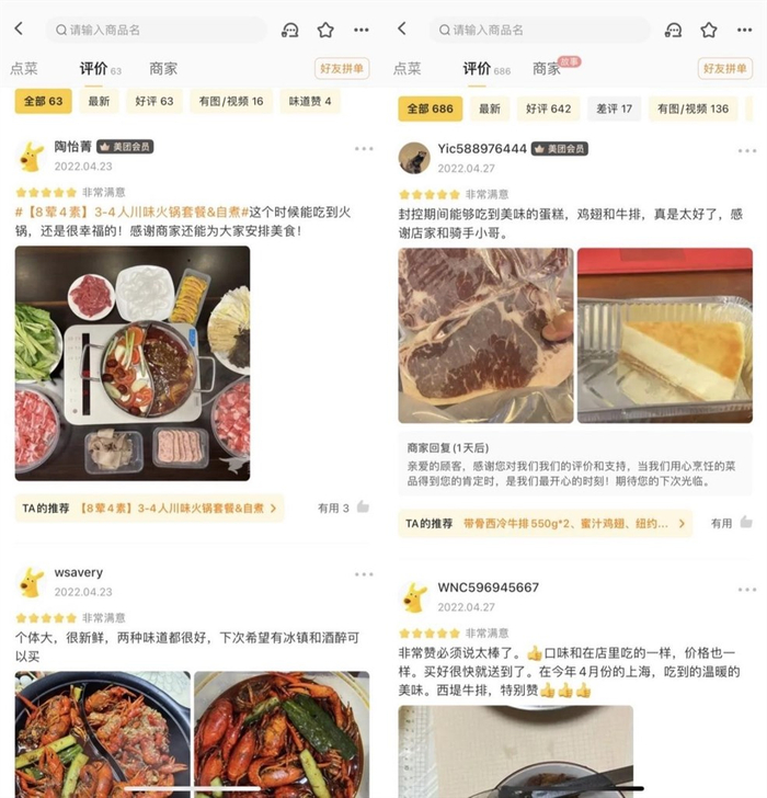 (美团外卖上,不少顾客评价表达疫情期间吃到火锅、牛排的幸福感)
