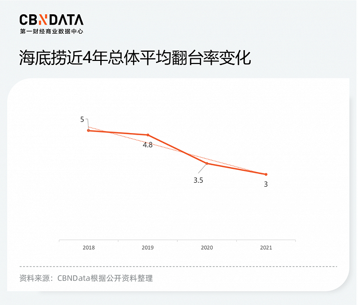但对于海底捞来说,这次翻台率的下降就没有可以弥补的余地了。平均每天3次的翻台率,是近5年来的最低水平。