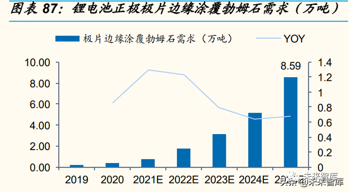 2025 年勃姆石市场空间超 66 亿,年复合增速达 60%。具体测算过程 如下:假设 1)2022/2023/2024/2025年勃姆石在无机涂覆材料里渗透 率分别为 52%/60%/68%/79%;2)正极极片边缘涂覆材料勃姆石渗透 率为 100%(正极涂覆勃姆石始于宁德时代,此前正极极片不涂覆, 目前据产业链反馈,正极涂覆 100%为勃姆石);负极边缘涂覆未大规 模起量,暂不考虑其市场份额 。我 们 测 算 得 到 :2022/2023/2024/2025 年,全球锂电池涂覆材料勃姆石需求(包含隔 膜涂覆+极 片 涂 覆 ) 预 计 为 7.33/12.67/20.46/34.39 万吨;2022/2023/2024/2025 年 勃 姆 石 市 场 空 间 预 计 达 14.67/25.10/40.13/66.76 亿元,年复合增速在 60%以上。