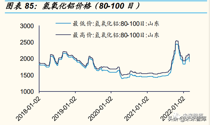 原材料国产化,成本逐年改善。勃姆石上游为氢氧化铝,含量占 比>99%,辅料为纯水(去离子水、软水),勃姆石原材料为普通化工 品,已完全国产化。2018-2020 年,氢氧化铝价格呈小幅震荡下降态 势,直至 2021 年中旬,价格开始不断攀升至 2000 元/吨附近,主要系 上游铝价持续走高。就具体公司来看,壹石通 2018-2020 年氢氧化铝 颗粒(氢氧化铝加工品)采购价格分别为 3917/3946/3436 元/吨,2019 年采购单价小幅上升主要系供应商改进了产品性能定价而小幅提 升,壹石通氢氧化铝颗粒供应商为中铝新材料和洛阳中超新材料。