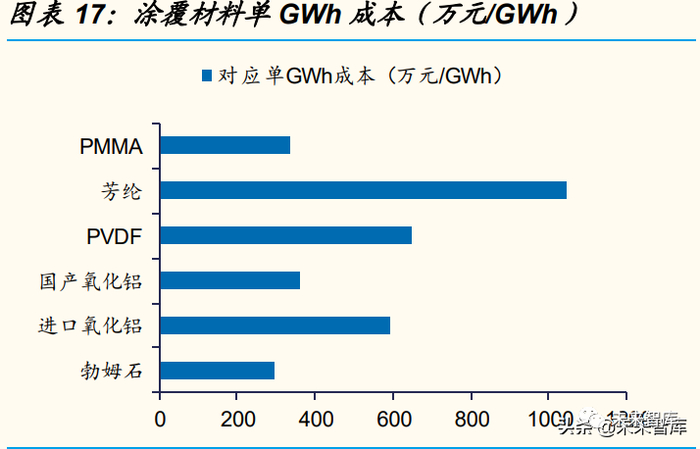 无机涂覆材料成本低,芳纶涂覆成本最高。我们选取主流的涂覆材料 进行成本对比,材料包括勃姆石、进口(日本)氧化铝、国产氧化铝、 电池涂覆级 PVDF、对位芳纶、PMMA。假设:1)1GWh 涂覆隔膜用 量为 0.17万平;2)涂覆膜良品率 70%;3)无机涂覆材料单层涂覆厚 度为 2um,有机涂覆材料单层涂覆厚度为 1.5um,其中 PMMA 单层涂 覆厚度为 2.5um;4)单位价格勃姆石/进口氧化铝/国产氧化铝/PVDF/ 芳纶/PMMA 分别为 2/3.5/1.9/10/20/1.85 万元/吨;5)人工、能耗、折 旧成本,勃姆石/进口氧化铝/国产氧化铝/PVDF/芳纶/PMMA 分别为 0.2/0.2/0.2/0.35/0.4/0.2 元/平。根据我们的测算,勃姆石/进口氧化铝/ 国产氧化铝/PVDF/芳 纶/PMMA 单位材料成本分别为0.17/0.35/0.21/0.38/0.62/0.20 元/平,单 GWh 总 成本分别为 296/595/360/648/1049/337 万元/GWh,勃姆石具有最低的单平涂覆材 料成本和单 GWh 涂覆成本。