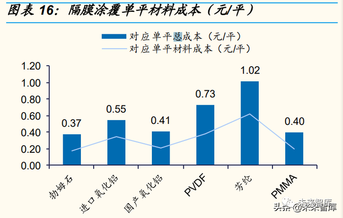 勃姆石更具性价比,对氧化铝形成替代。无机物采用水性浆料,其成 本大致可拆分为浆料成本+制造成本,其中浆料包括陶瓷材料、水、粘 合剂、分散剂、增稠剂;制造费用包含人工、能耗、折旧。根据测算, 单平陶瓷涂覆材料成本中占比较大的有陶瓷、人工、能耗及折旧成本, 分别占比约 45%、18%、18%、9%。当前价格下,勃姆石、氧化铝的 单位成本差别不大:按照勃姆石、进口氧化铝、国产氧化铝的单位价 格分别为 2.0、3.5、1.9 万元/吨计算,单平成本分别为 0.37、0.55、 0.41 元/平,其中单平材料成本分别为 0.17、0.35、0.21 元/平,制造 成本均为 0.20 元/平左右,包含加工、设备折旧等费用。考虑到勃姆石 性能指标优势强于氧化铝,二者成本差异较小,我们认为勃姆石综合 性价比更高,对氧化铝形成替代。