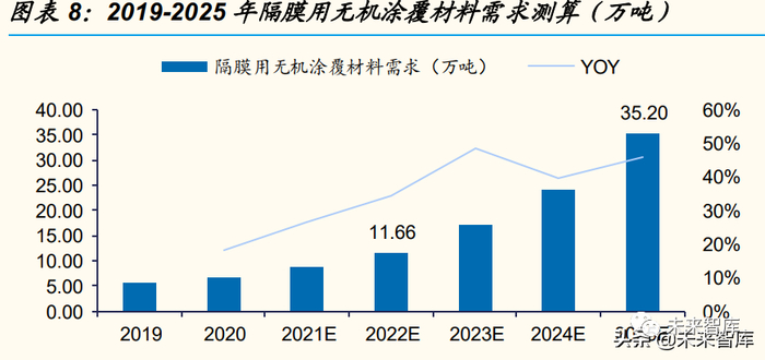 涂覆材料市场空间 2025 年预计超 140 亿。考虑到不同涂覆结构类型 在市场中占比不同,假设 2022 年,双面单层涂覆(无机物)/双面单 层或单面双层涂覆(有机物&无机物)/单面单层涂覆(无机物)/其他 涂 覆 ( 有 机 物&无 机 物 ) 分 别 占 比 为 9%/19%/67%/5%。假 设 2022/2023/2024/2025 年 全 球 锂 电 池 合 计 需 求 为 693/1078/1531/2231GWh,在 70%涂覆膜良品率下,对应全球涂覆隔 膜需求分别为 157/236/326/462 亿平,年复合增速在 40%以上,对应 隔膜用无机涂覆材料需求分别为 11.66/17.32/24.17/35.20 万吨,对应 隔膜用有机涂覆材料需求分别为 1.64/2.62/4.34/7.46 万吨;假设极片 边缘涂覆单 GWh 用量为 50 吨,极片边缘 涂覆渗透率分别为 51%/58%/67%/77%, 对 应 极 片 边 缘 涂 覆 材 料 需 求 为 1.76/3.14/5.12/8.59 万吨。假设无机涂覆材料平均价格在 1.9-2 万元/ 吨,有机涂覆材料平均价格在 7-9 万元/吨,极片边缘涂覆材料价格在 1.9-2 万元/吨,根据我们的测算 2022/2023/2024/2025 年,涂覆材料 市场空间分别为 39.04/59.52/88.84/140.92 万吨,年复合增速在 50% 以上。