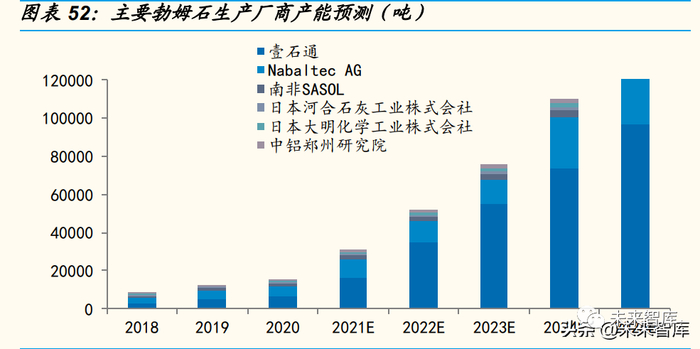 3)中铝郑州研究院:公司为国内主要勃姆石生产商,其产品主要应用 于催化剂和阻燃剂领域,少量应用于动力锂电池隔膜涂覆;2018 年公 司勃姆石份额为 5%,2019 年略有下滑至 2%。