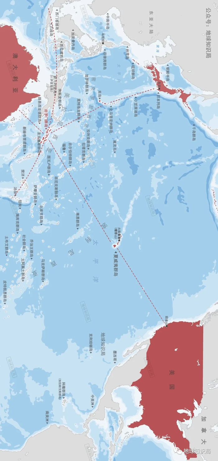 美国本土——夏威夷群岛——所罗门群岛——澳大利亚▼