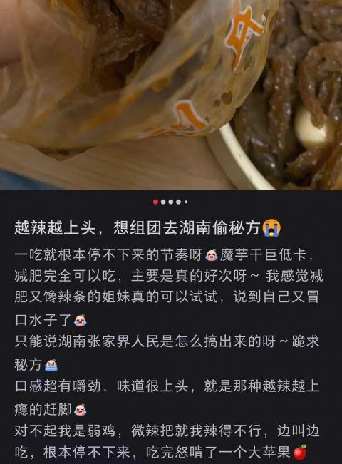 魔芋干究竟有多令人上头?张家界不允许任何一位手握魔芋干的人不成为社牛(俗称社交达人)。大学室友初见——分享魔芋干;同事破冰——安利魔芋干;甚至第一次去按摩,也忍不住用魔芋干替自己social。