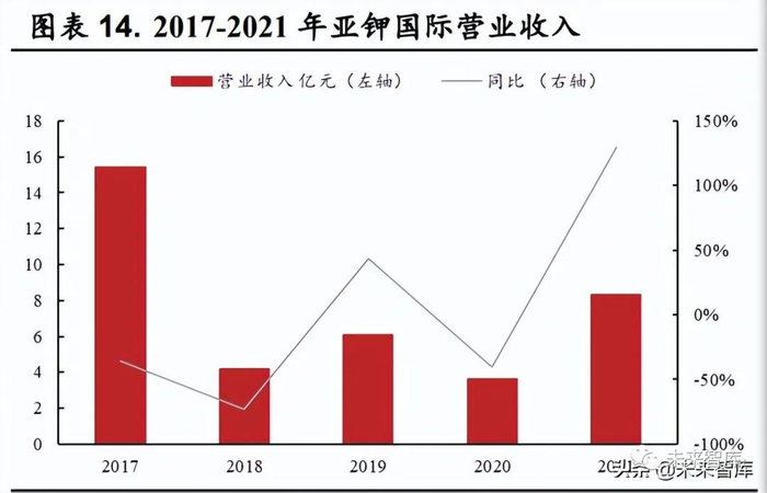 2021 年亚钾国际扣非归母净利润增长62 倍。公司2021 年年报于2022年 4 月 2 日披露,2021 年全年实现营业收入8.33 亿元,同比增长129.4%;归母净利润 8.95 亿元,同比增长 1401.4%;扣非归母净利润2.90亿元,同比增长 6232.5%。