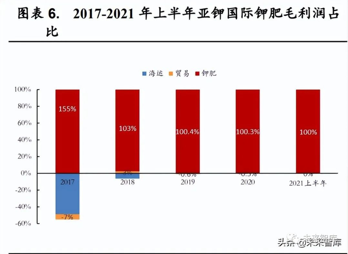亚钾国际聚焦钾肥的生产和销售,2021 年公司产能增长达4倍。自2017年起逐渐剥离海运、贸易等业务,截至 2021 年上半年,公司已实现海运、贸易业务的完全剥离,钾肥业务在公司毛利润中的占比已达到100%。2017-2021 年公司钾肥产量稳步增长,从2017 年的17.3 万吨增长至2021年的 33.2 万吨。2021 年公司完成钾肥新增产能扩产项目建设,钾肥产能由之前的 25 万吨扩充至 100 万吨,目前已于2022 年3 月底稳定达产。