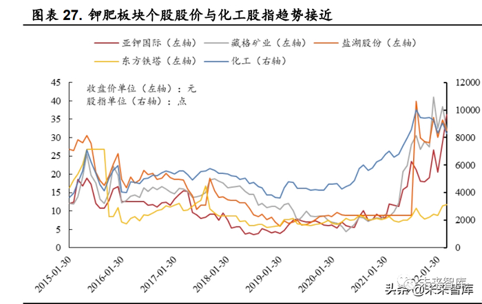 钾肥板块的成长性主要来自两方面。一方面是国内钾肥企业依托盐湖资源和自身技术优势发展盐湖提锂,生产碳酸锂。碳酸锂下游为新能源汽车产业链,新能源需求的增长赋予了板块高成长性,相关企业为盐湖股份、藏格矿业。另一方面是海外钾肥企业积极扩产,产能增量为企业带来成长空间。如亚钾国际已完成产能从 25 万吨扩充至100 万吨,增量为4倍;东方铁塔启动了新增 100 万吨(一期 50 万吨)产能项目的建设,未来项目一期建成后,公司产能将从原有的 50 万吨扩充至100 万吨。(报告来源:未来智库)