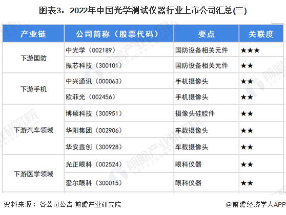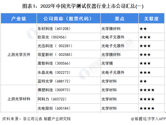 光学测试仪器行业上游为光学元件和光学材料,光学元件代表性企业有东材科技(601208)、欧菲光(002456)、光迅科技(002281)、激智科技(300566);光学材料的代表性企业有佛塑科技(000973)、阿科力(603722)、光电股份(600184)等;中游光学仪器检测行业主要公司有奥普光电( 002338)、凤凰光学(600071)、远方信息(300306)、天瑞仪器(300165)等;下游应用行业包括国防、汽车、手机和医疗领域,其中国防军工的代表性企业有天奥电子(002935)、雷科防务(002413)、亚光科技(300123),汽车的代表性企业有华阳集团(002906)、华安鑫创(300928);手机的代表性企业有中兴通讯(000063);医疗的代表性企业有光正眼科(002524)和爱尔眼科(300015)。