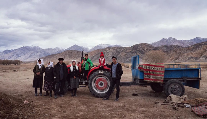 一大家子站在红色拖拉机前,远山、原树,黄土地,顿时有了俄罗斯列宾风格的历史沧桑感。两个孩子不停作出各种调皮可爱的神情,主人拿出油炸果子和各种糖果招待我们,临走时坚持用塑料袋装上一带让我们带走。