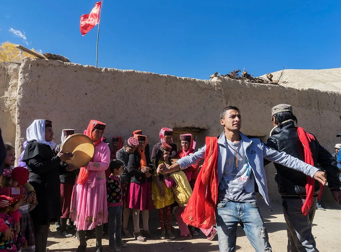 在瓦罕走廊偶遇一家塔吉克人家举行婚礼,场面热闹非凡。手鼓奏响节奏分明的欢快舞曲,人们载歌载舞。女人们都穿上了颜色鲜艳的衣裙,老人、妇女、小孩欢快地聊天。这是塔吉克人一个重要的社交场合。主人热情相邀,我也加入了欢乐的舞蹈。