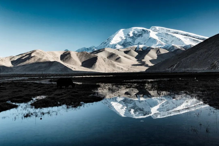 从喀什去往塔什库尔干的公路从白沙湖畔绕过。在这个海拔3300米的高原湖泊能看到雪山、湖水和沙漠交相辉映的奇幻景观。如镜的湖面倒映出赫赫有名的公格尔峰和公格尔九别峰(柯尔克孜族语“白色的帽子”),还有大大小小数十座绵延上千米的沙山,白沙湖就像一颗明珠镶嵌其中。