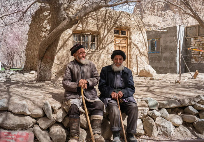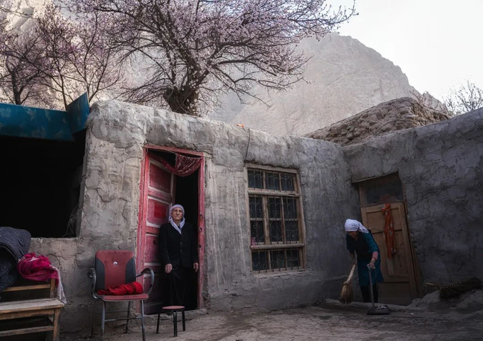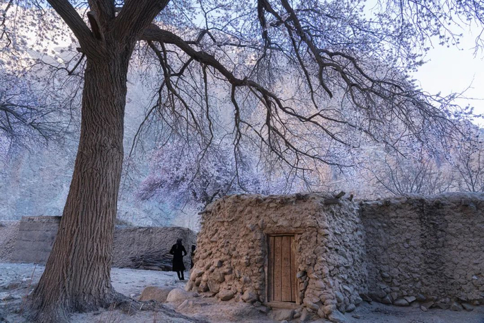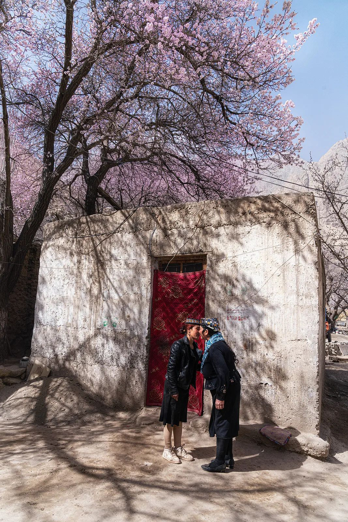杏林中跑出来一群早起上学的孩子;一位85岁的老爷爷在杏花树下悠闲地梳理着胡子;一个塔吉克汉子正站在牛圈上面干活,身后的杏花海像是为他搭建了一个绝妙的舞台背景。两个塔吉克妇女见面,在亲热地互行吻面礼,巨大的枝干在她们身上投下斑驳的影子。那边,母女俩在老杏树下席地而坐,母亲用石头砸开杏仁,喂进女儿的嘴里,那画面温馨得让人心醉。村边有一家人在宰羊,屠夫把羊倒挂在杏树的枝杈上,那个角度正好干活顺手。
