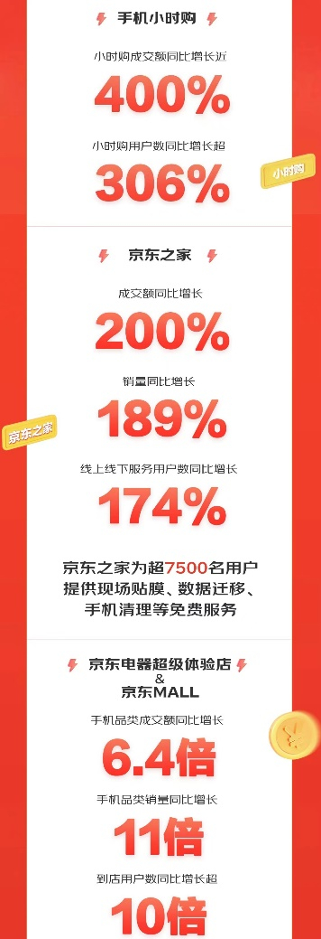 如今,在选购手机产品时,越来越多消费者选择走进线下门店体验之后再下单,京东之家、京东电器超级体验店、京东MALL等门店就成了用户体验的首选。数据显示,京东之家成交额同比增长200%,销量同比增长189%,线上线下服务用户数同比增长174%,为7500名用户提供了贴膜、数据迁移、手机清理等免费服务;京东电器超级体验店&京东MALL手机品类成交额同比增长6.4倍,手机品类销量同比增长11倍,到店用户数同比增长超10倍。