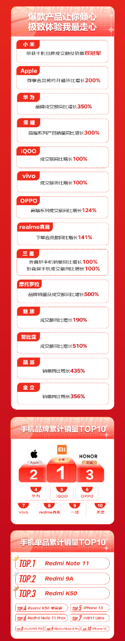 京东手机超级品类日活动期间,各品牌增长表现十分亮眼。小米、Apple、荣耀、华为、iQOO、OPPO、vivo、realme真我、一加、天语不负众望,拿下手机品牌累计销量TOP10的好成绩,在单品累计销量方面,Redmi Note 11、Redmi 9A、Redmi K50、Redmi K50电竞版包揽前四,iPhone 13则位列第五,Redmi Note 11 Pro+、小米11 Ultra、华为P50、Redmi Note 9 Pro、iPhone 12分列前十其余位置。