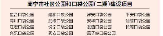 据了解,口袋公园集休闲、健身、娱乐于一体。待南宁市社区公园和口袋公园项目(二期)建成完工开放后,将为附近居民提供休闲健身好去处。同时,通过打造一个个社区公园和口袋公园,实现“城在园中、人在景中”的宜人景象,以微景观“温暖”大民生,持续提升宜居宜业的城市品质。