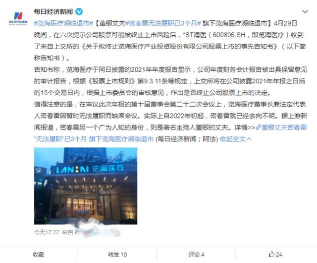 媒体报道称,4月29日前,董卿老公密春雷旗下的一家上市公司已经收到了6次提示公司股票可能被终止的上市风险,于是收到了上交所关于终止该公司股票上市的事先告知书。
