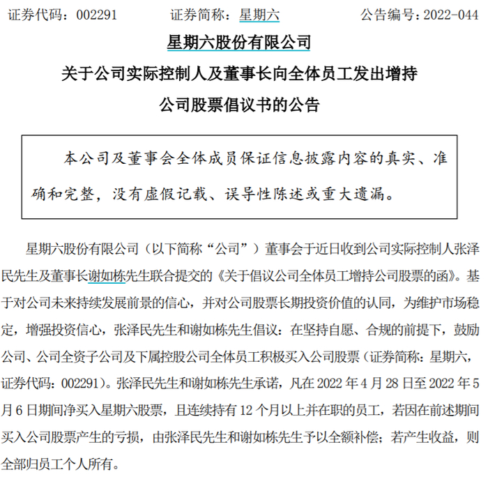 张泽民先生和谢如栋先生同样承诺,凡在2022年4 月28日至2022年5月6日期间净买入星期六股票,且连续持有12个月以上并在职的员工,若因在前述期间买入公司股票产生的亏损,由张泽民先生和谢如栋先生予以全额补偿;若产生收益,则全部归员工个人所有。