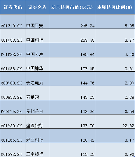 长江电力(600900)、五粮液(000858)、贵州茅台(600519)、建设银行(601939)、兴业银行(601166)、工商银行(601398)持股市值均超过100亿元,分别为144.76亿元、143.25亿元、138.20亿元、137.70亿元、128.62亿元、115.25亿元。