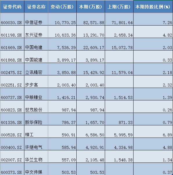 具体而言,对中信证券(600030)增持了1.08亿股。东兴证券(601198)紧随其后,增持数量同样超过1亿股,合计增持1.06亿股。同时,对中国电建(601669)增持超过5000万股,合计增持7536.39万股。